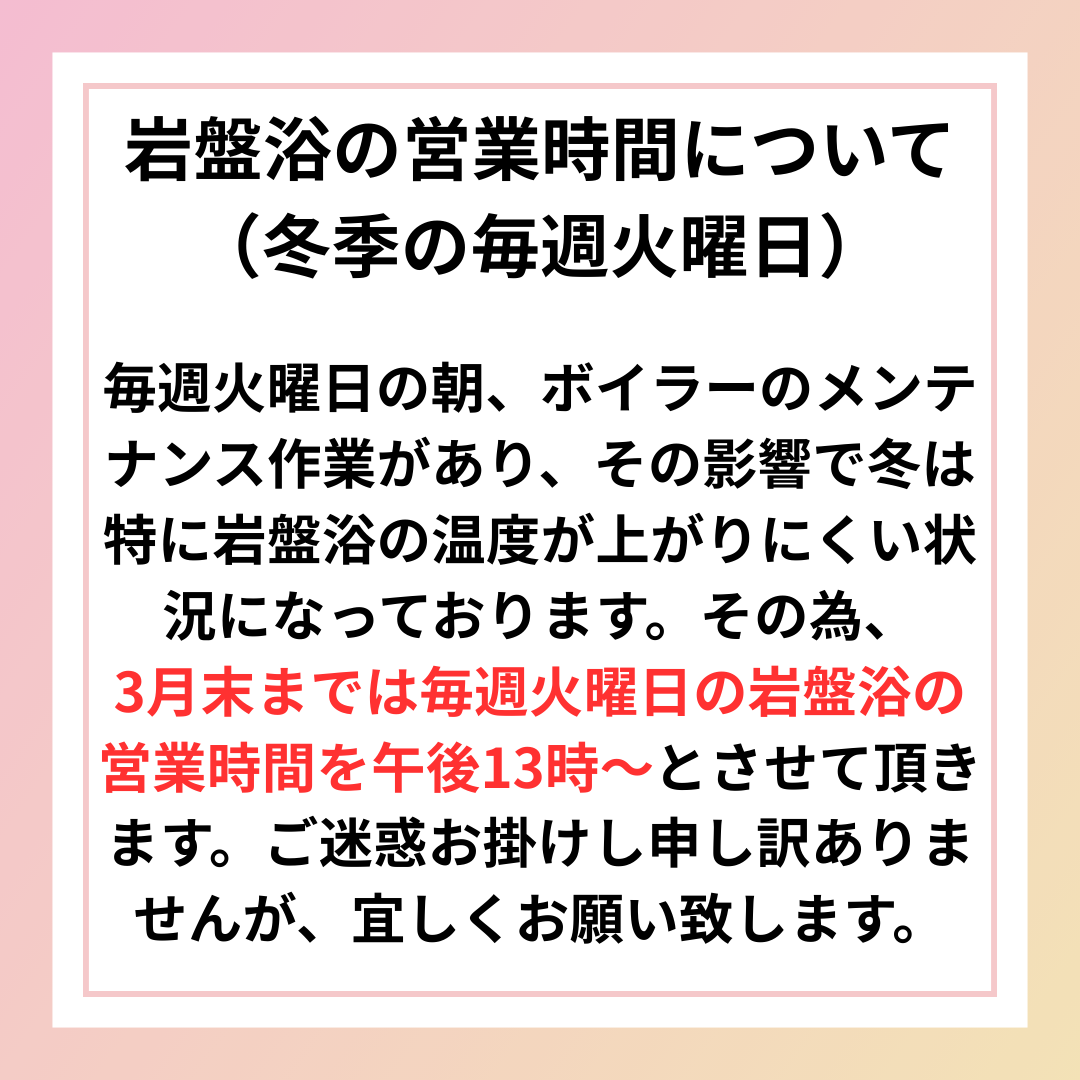 岩盤浴の営業時間(冬季の毎週火曜日)